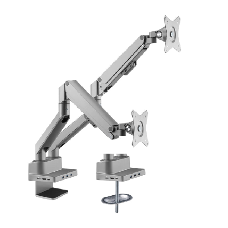 Product Category: Gas Spring Monitor Arm Rank: Standard Material: Aluminum,Steel,Plastic Surface Finish: Powder Coating Color: Matte Black,Matte Silver Dimensions: 1018x115x560mm (40.1"x4.5"x22") Fit Screen Size: 17"-32" Fit Curved Monitor: Yes Screen Quantity: 2 Weight Capacity (per screen): 1~9kg (2.2lbs~19.8lbs) VESA Compatible: 75x75,100x100 Tilt Range: +45°~-45° Swivel Range: +90°~-90° Screen Rotation: +180°~-180° Arm Full Extension: 492mm (19.4") Installation: Clamp,Grommet Suggested Desktop Thickness: Clamp:10~50mm Grommet:10~45mm (Clamp:0.39"~2" Grommet:0.39"~1.8") Quick Release VESA Plate: Yes USB Port: 3xUSB 3.0 Port Other Port: 2xHMDI 2.0,1xRJ45,1x100W PD,1xTYPE-C Upstream Port,1xPower Light Cable Management: Yes Certification: CE,FCC,UKCA Accessory Kit Package: Normal/Ziplock Polybag,Compartment Polybag |