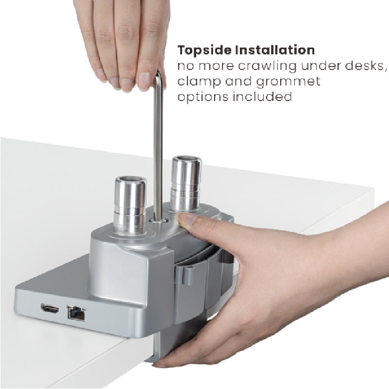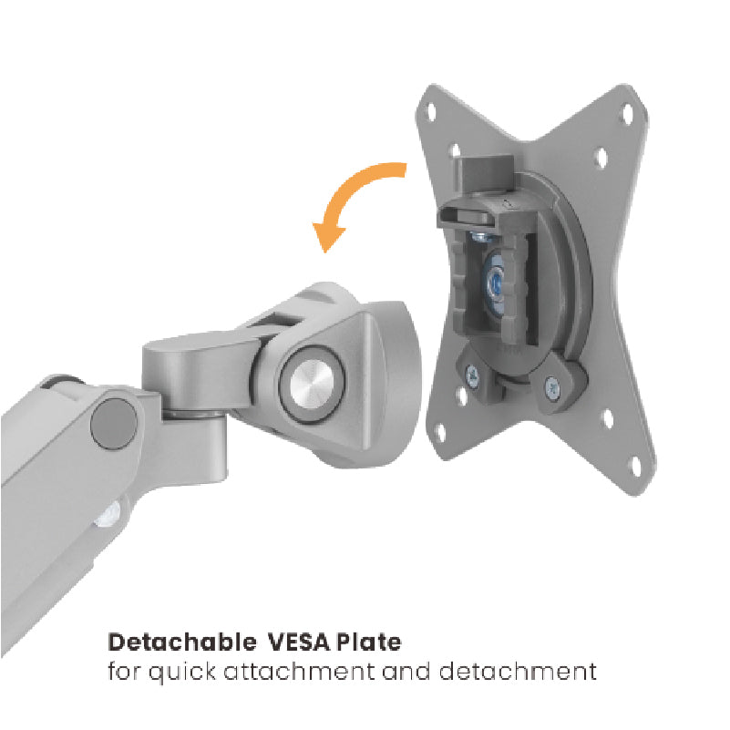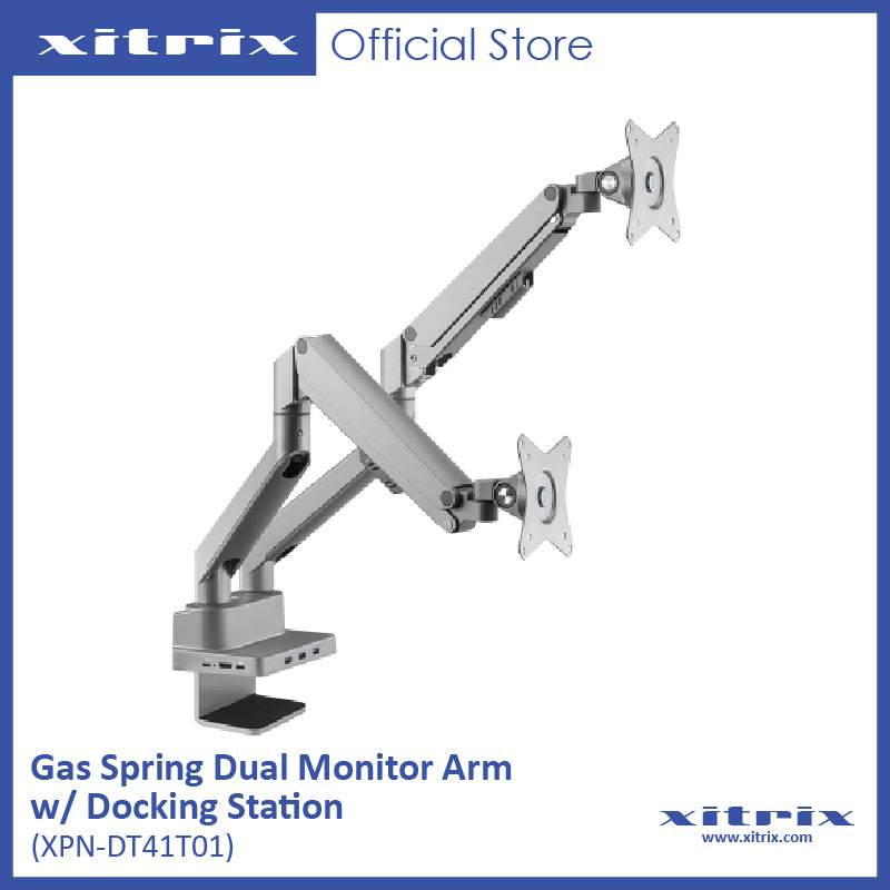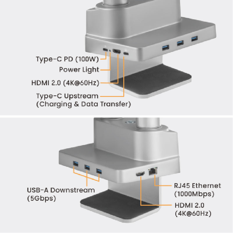 Smart Gas Spring Monitor Arm with 8-IN-1 Docking Station ●Built-in Ethernet, HDMI, USB-A and TYPE-C ports for connection ●Installs from Top Side: installs entirely from above the desk surface ●Built-in Spring Tension Mechanism: for perfect weight adjustments ●A full featured TYPE-C cable included provides USB 3.0 data transition ●Detachable VESA Plate Design: enables easy installation ●Built-in Cable Management: for an organized and neat workspace |