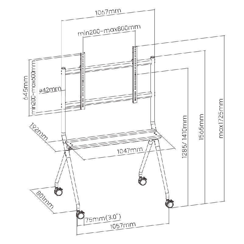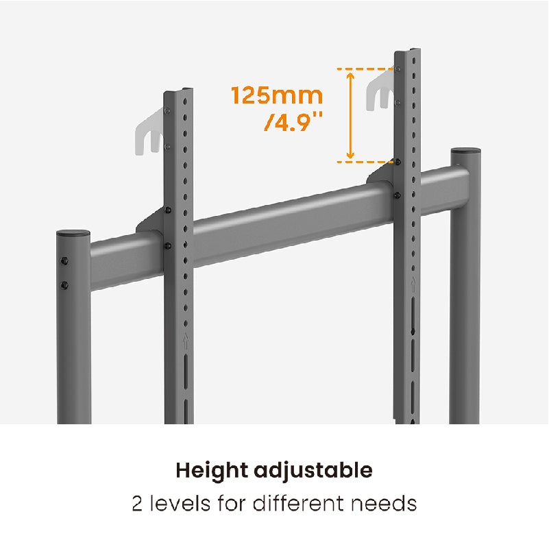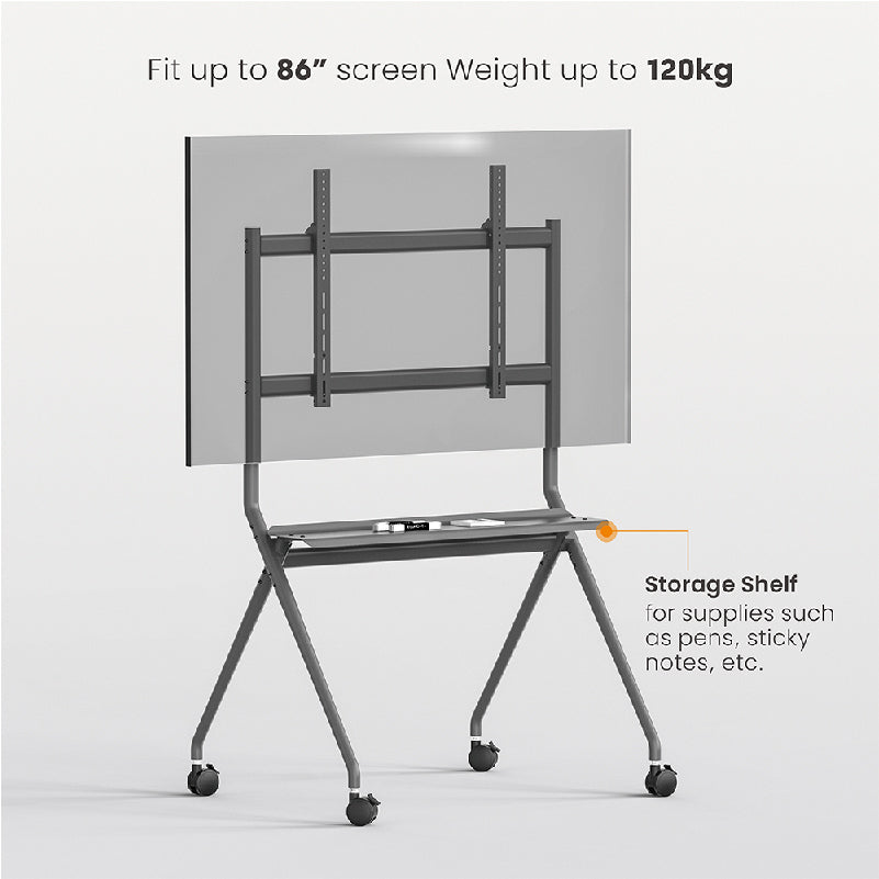 The Xitrix Heavy-Duty Studio TV Cart fits best on TVs from 50"-86". The screen can adapt to two positions, adjusting the viewing height to accommodate different TV sizes and application needs. The studio TV cart moves with the person to make work more efficient. Four large 75mm casters with durable materials support 360° all-round rotation to ensure mobility and flexibility.